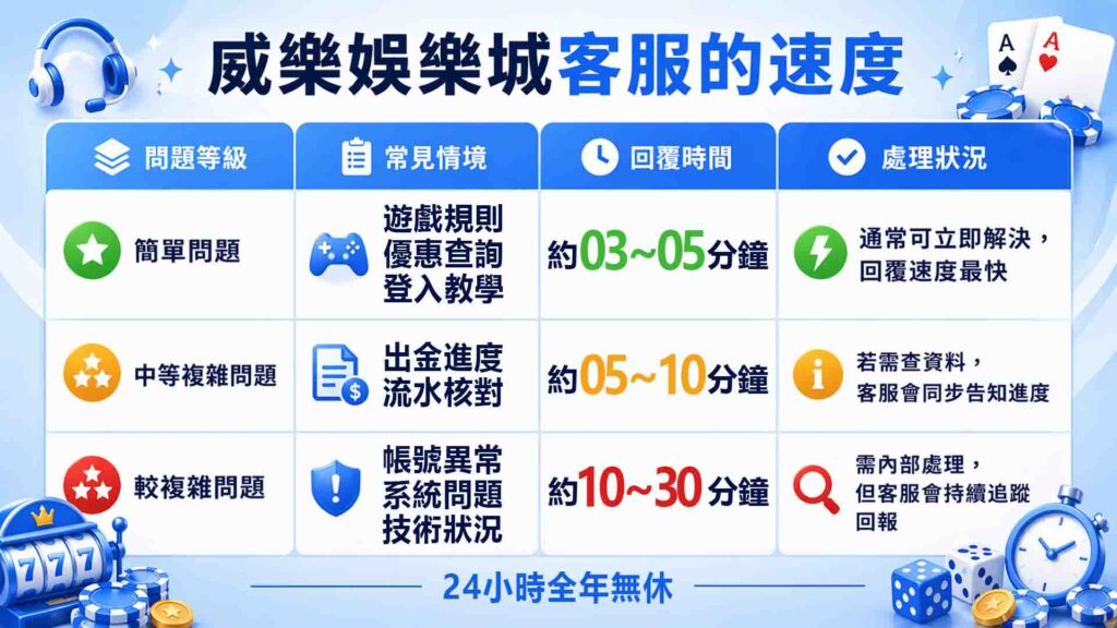 | 簡單問題 | 遊戲規則、優惠查詢、登入教學 | 約 3~5 分鐘 | 通常可立即解決,回覆速度最快 |